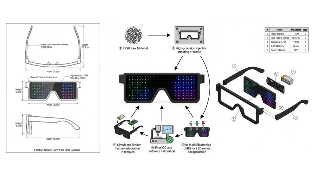 Prompt: Generate a production-ready design with materials, measurements, and manufacturing detail for a render of programmable LED pixel glasses. Glasses feature a durable matte black injection-molded plastic frame with wraparound visor-style lenses. Lenses are transparent smoked polycarbonate with embedded high-density RGB LED matrix arrays evenly distributed across both lenses. LEDs are individually addressable and capable of displaying text, symbols, and animated pixel patterns. Frame includes concealed wiring channels, integrated control module within the temples, and rechargeable lithium battery with USB-C port. Design emphasizes comfort, balanced weight distribution, ventilation, and everyday wearability.