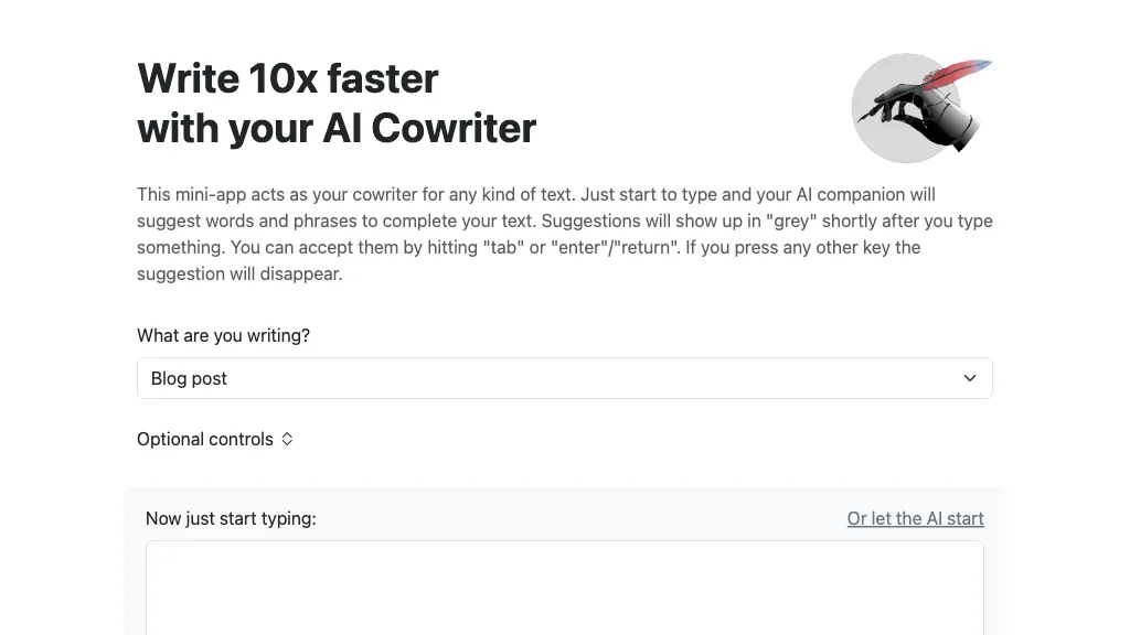 AI Cowrit is a mini-app that uses AI to speed up writing by suggesting words and phrases.