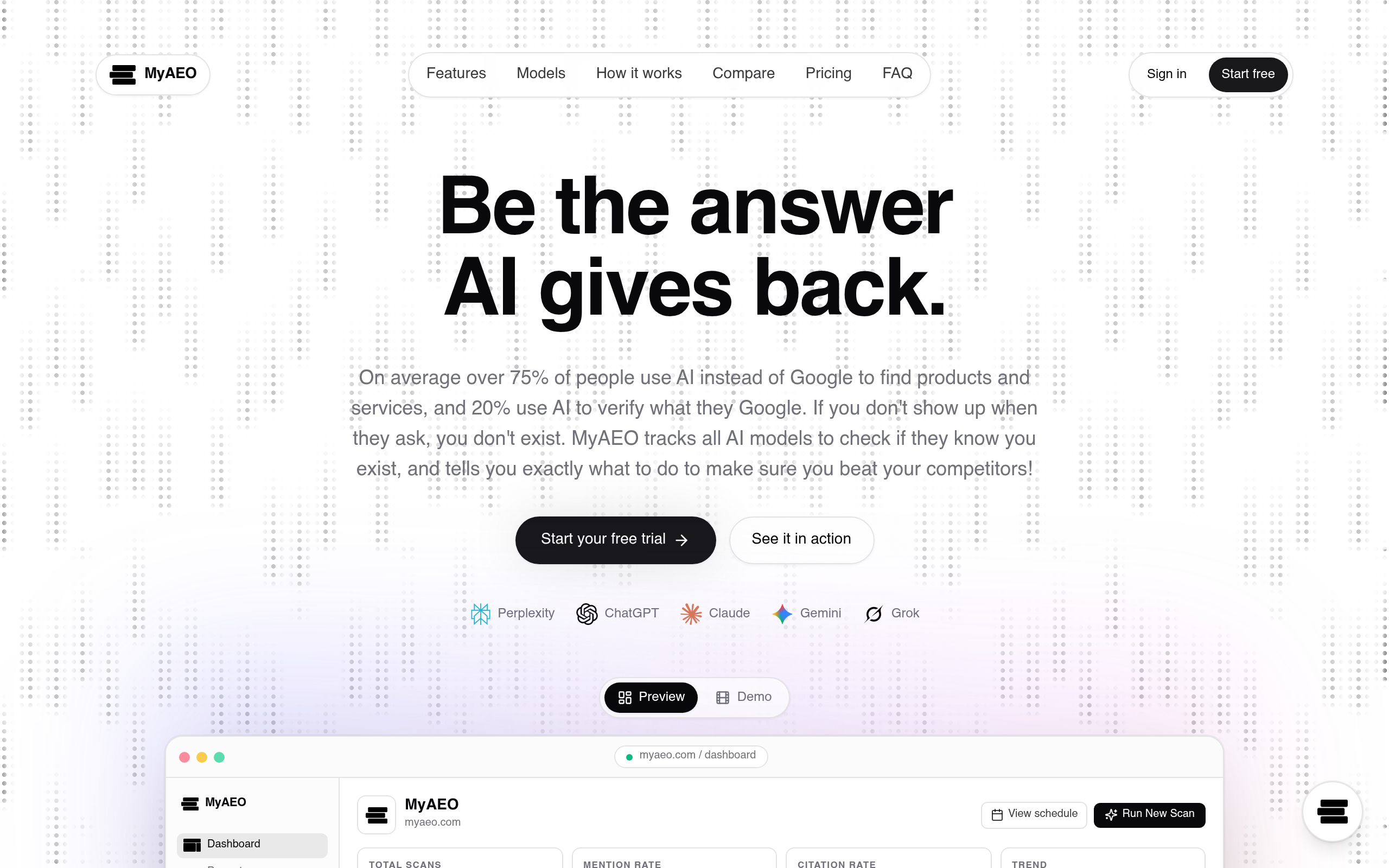 MyAEO is an AI-powered brand recognition and analytics platform that helps businesses get their brand recognized by artificial intelligence systems. The platform provides live tracking and analytics to monitor how AI models and systems perceive and reference your brand across the digital landscape.