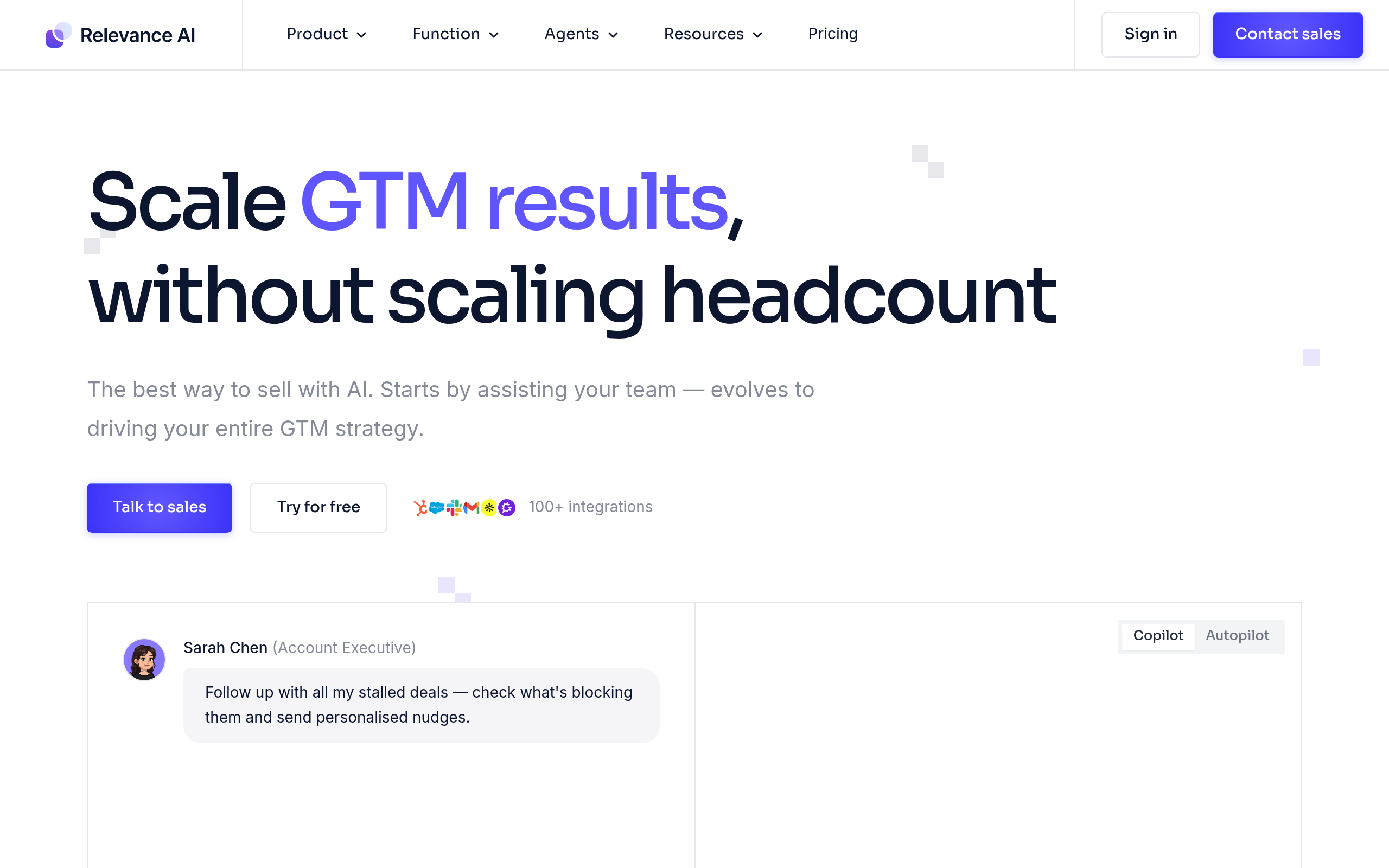 Relevance AI is a platform for building and deploying AI agents and copilots for enterprise teams. It enables companies to create custom AI assistants that integrate with existing tools and workflows.